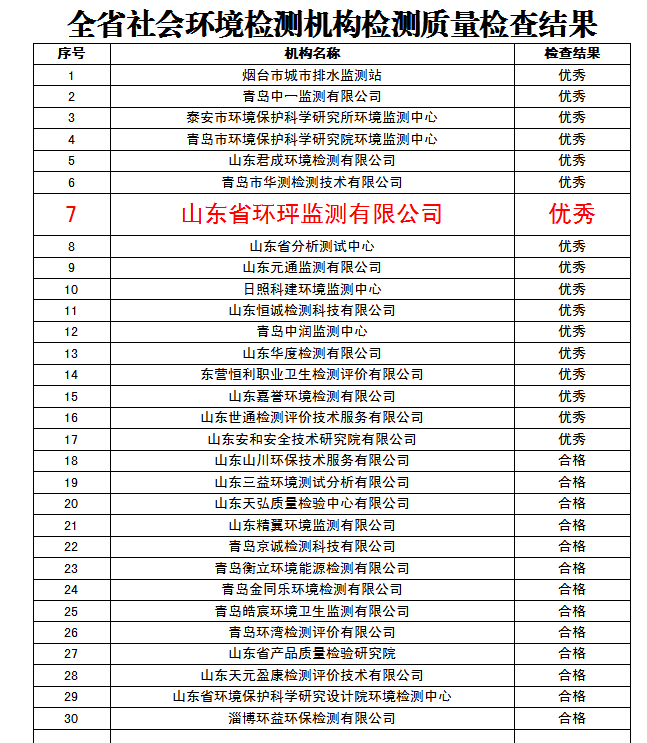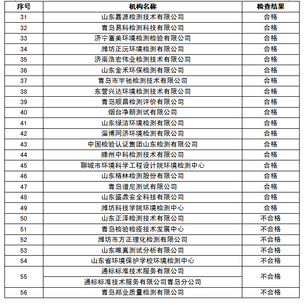 通过检查,烟台市城市排水监测站等17家机构结果为优秀(综合得分85分及以上),山东山川环保技术服务有限公司等32家机构结果为合格(综合得分60-85分),青岛郑业质量检测有限公司等7家机构结果为不合格(综合得分60分以下)。